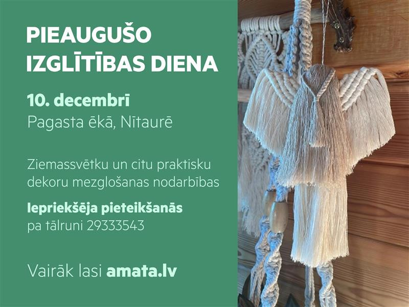 Aicinām iedzīvotājus piedalīties Pieaugušo izglītības dienā 10. decembrī Pagasta ēkā, Nītaurē. Šajā dienā interesentiem būs iespēja apgūt radošās prasmes, veidojot Ziemassvētku dekorus un praktiskus mezglojumus mājoklim.
