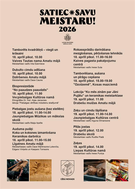 Jau 18. reizi visā Latvijā norisināsies nemateriālā kultūras mantojuma saglabāšanas pasākums “Satiec savu meistaru!”. Tradicionālo amatu prasmju meistari Cēsu novadā gaidīs interesentus 18. un 19. aprīlī.