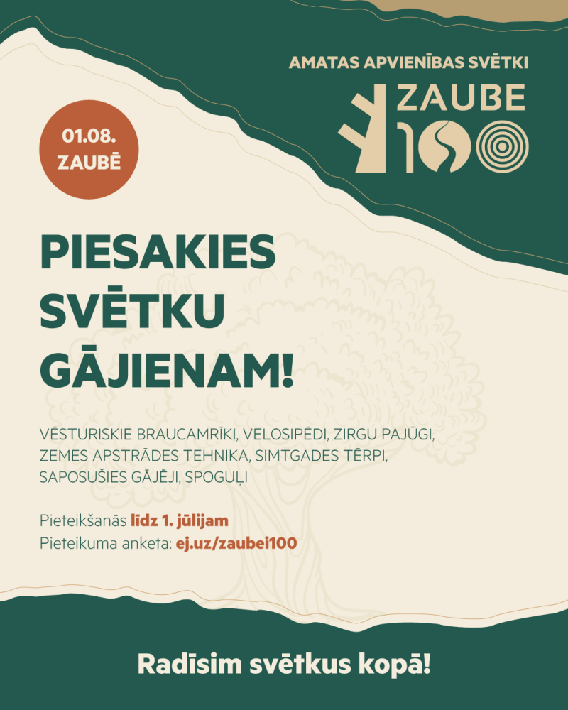 Svinot Zaubes nosaukuma 100 gadus, aicinām vietējos iedzīvotājus un viesus piedalīties svētku gājienā un bagātināt to ar rotātiem vēsturiskiem braucamrīkiem – no zirgu pajūgiem līdz zemes apstrādes tehnikai, ne tikai 100 gadus seniem, bet arī padomju laiku spēkratiem.