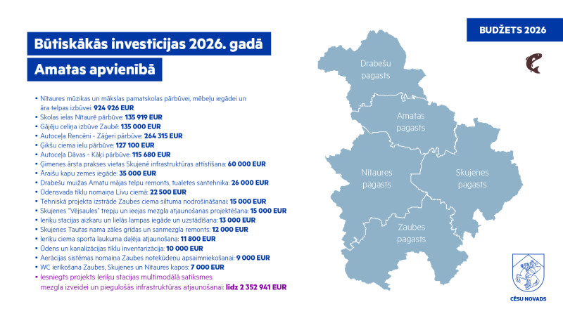 Amatas apvienības pārvaldes vadītāja Elita Eglīte uzsver: “Amatas apvienības 2026. gada budžeta prioritāte ir satiksmes infrastruktūras uzlabošana – pašvaldības ceļu un ielu atjaunošana Amatas, Drabešu, Nītaures un Skujenes pagastā, kā arī Zaubes gājēju celiņa izbūve. Tiks palielināti resursi ikdienas ielu un ceļu uzturēšanai, vienlaikus nodrošinot rūpīgāku finanšu līdzekļu izlietojuma kontroli. Pēc renovācijas plānota arī Nītaures Mūzikas un mākslas pamatskolas un pirmsskolas grupu vienota darba uzsākšana.”