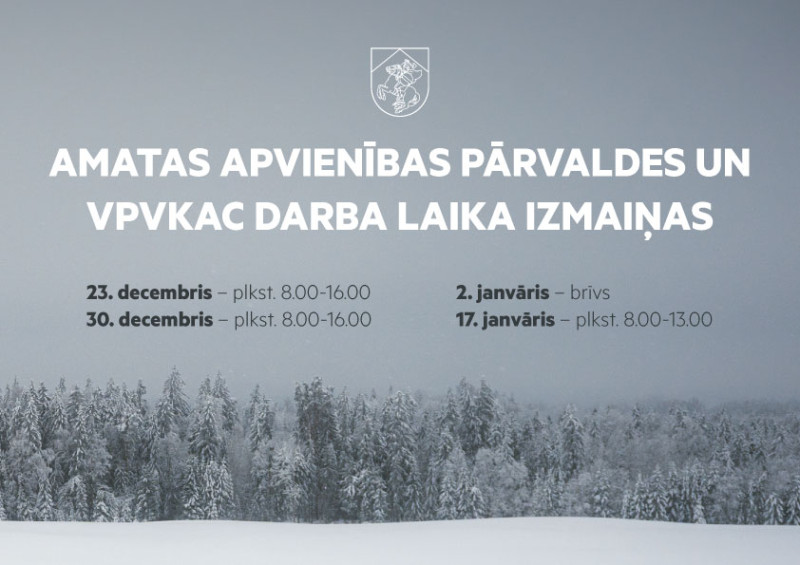 Informējam, ka svētku laikā mainīts Amatas apvienības pārvaldes un Valsts un pašvaldību vienoto klientu apkalpošanas centru (VPVKAC) darba laiks: