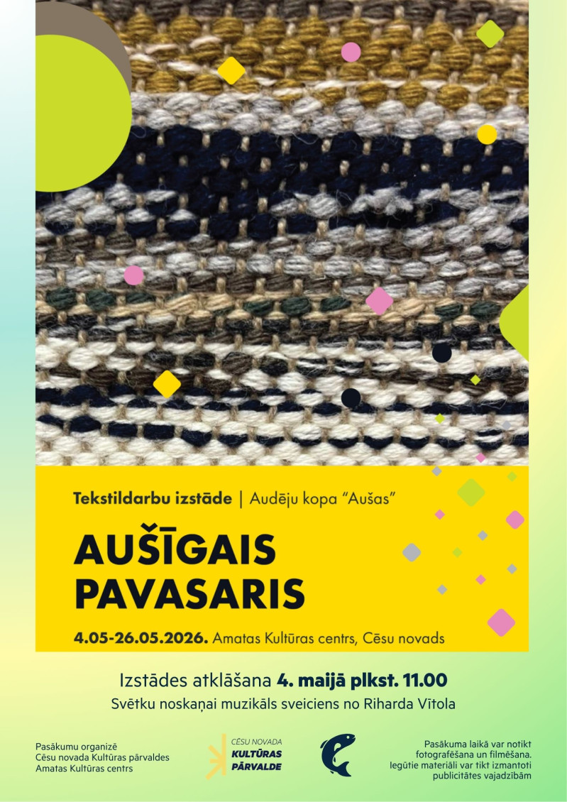No 4. līdz 26. maijam Amatas Kultūras centrā apskatāma audēju kopas "Aušas" tekstildarbu izstāde "Aušīgais pavasaris"