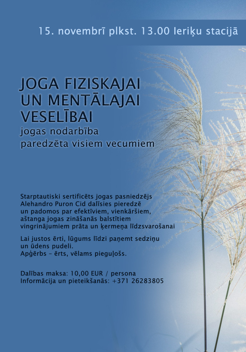 Sestdien, 15. novembrī, plkst. 13.00, piedzīvo mieru, līdzsvaru un enerģiju nodarbībā "Joga fiziskajai un mentālajai veselībai".
