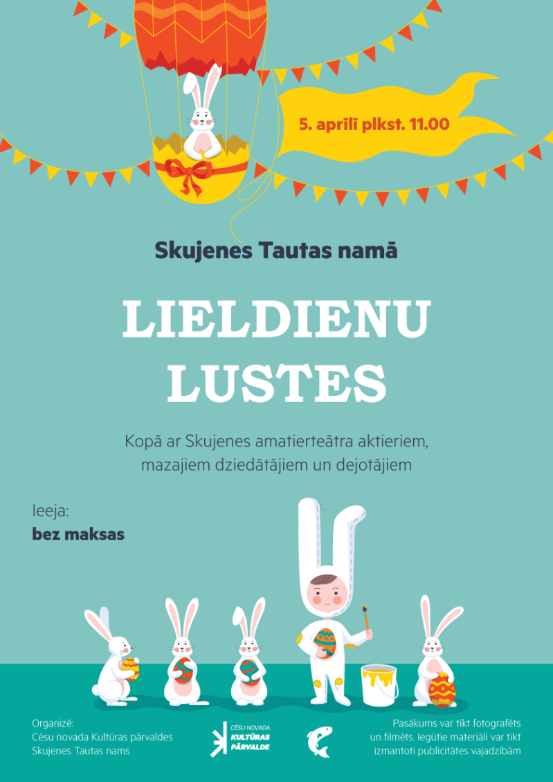 Lieldienās, 5. aprīlī, plkast. 11.00 Skujenes Tautas nams aicina uz Lieldienu lustēm kopā ar Skujenes amatierteātra aktieriem, mazajiem dziedātājiem un dejotājiem.