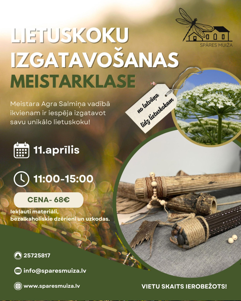 Aicinām uz īpašu, radošu pieredzi Spāres muižā, kur Gleznošanas studijas Mākslas Pietura meistara Agra Salmiņa vadībā būs iespēja izgatavot savu lietuskoku no latvāņa – instrumentu ar maigu, nomierinošu skaņu, kas atgādina lietus čaboņu.