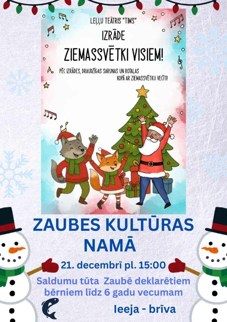 Svētdien, 21. decembrī, plkst. 15.00 Zaubes Kultūras namā notiks pirmsskolas bērnu Ziemassvētku eglīte ar Ziemassvētku vecīti un leļļu teātra izrādi.