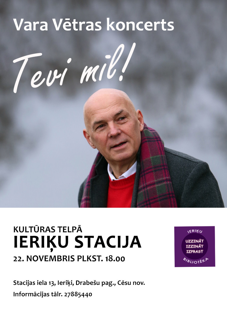 Latviešu aktieris, mūziķis un dzejnieks Varis Vētra aicina uz sirsnīgu tikšanos ar dziesmām, dzeju un dzīves stāstiem 22. novembrī plkst. 18.00 kultūras telpā "Ieriķu stacija".